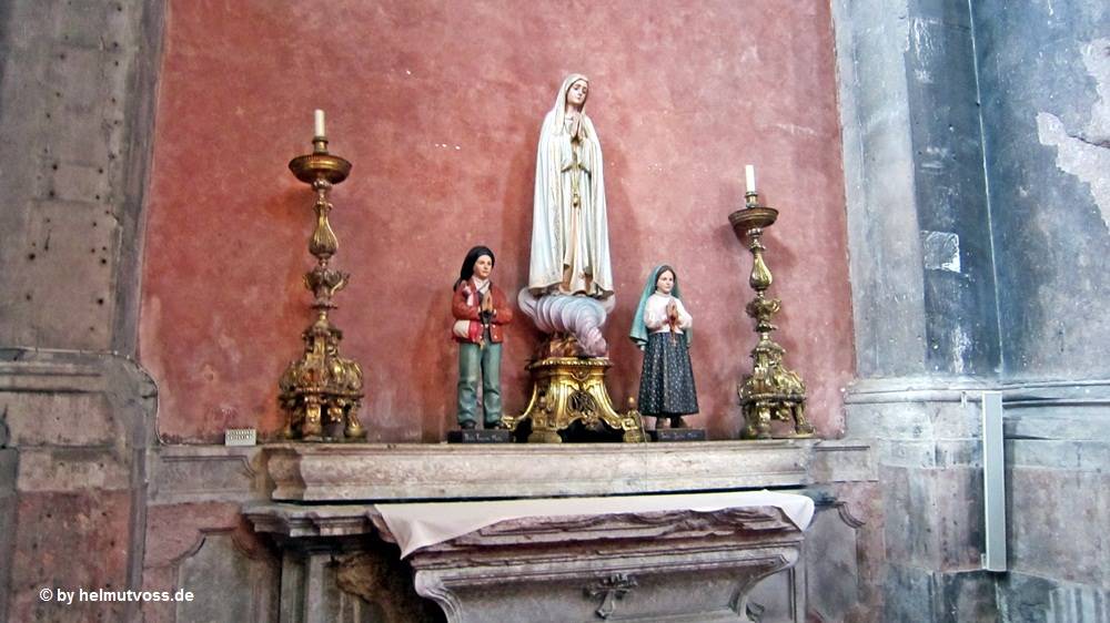 Die drei Altäre auf der linken Seite des Kirchenschiffes, 1) Madonna von Fatima, mit den Hirtenkindern, 2) der heiligen Christophorus.
