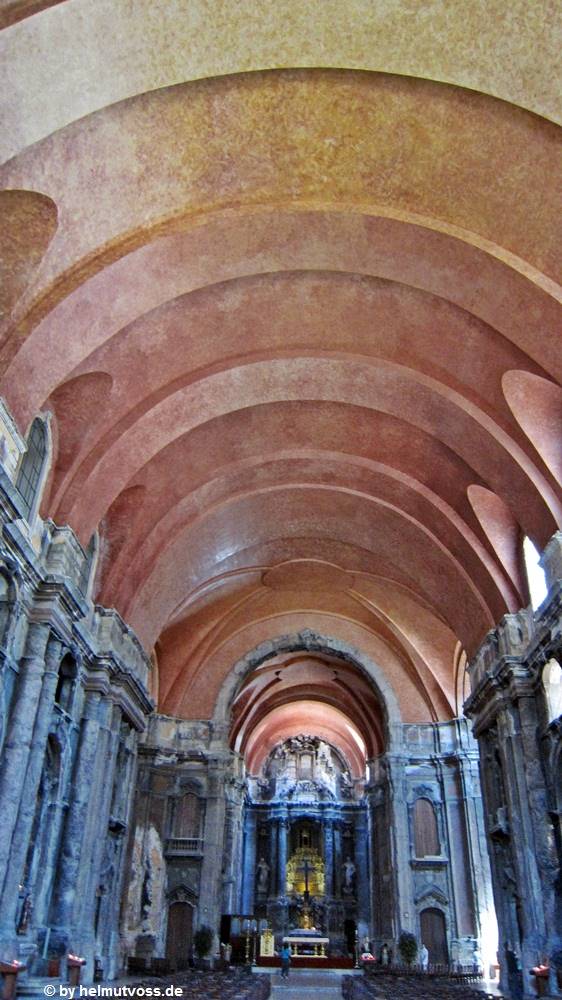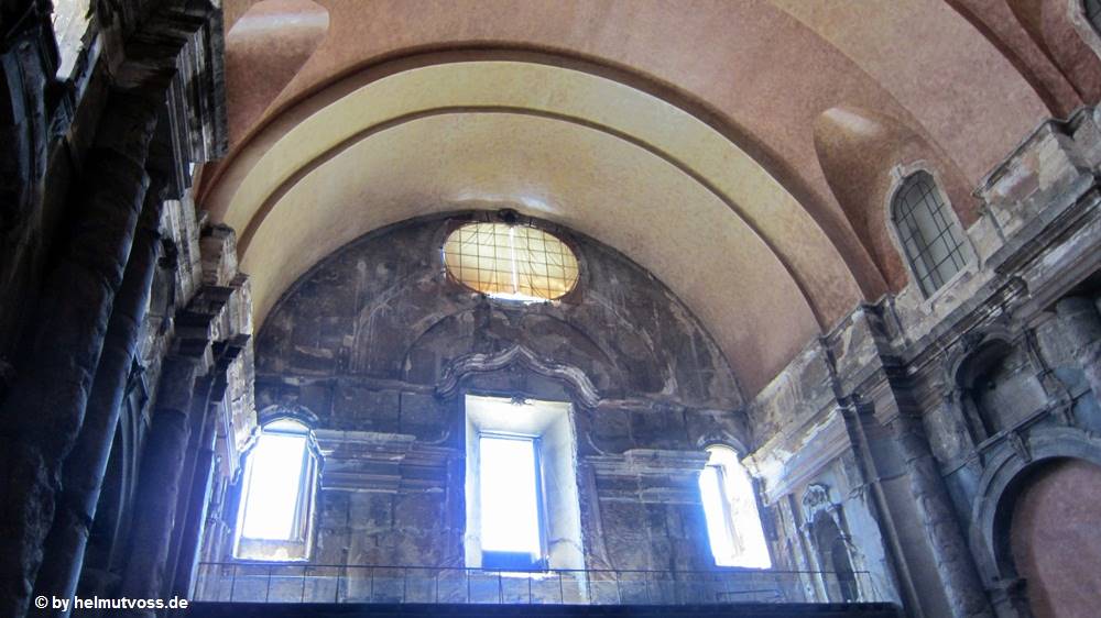 Die Doppelsäulen der Seitenwände sind in einem verwittertem Zustand, das Tonnengewölbe in dunkelorange.
