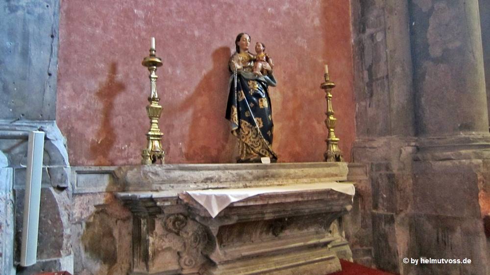 Keine gewaltigen Heiligenbilder sind hier zu sehen, aber auf den schmalen Seitenaltären Heiligenstatuen und vergoldete Kerzenleuchter.