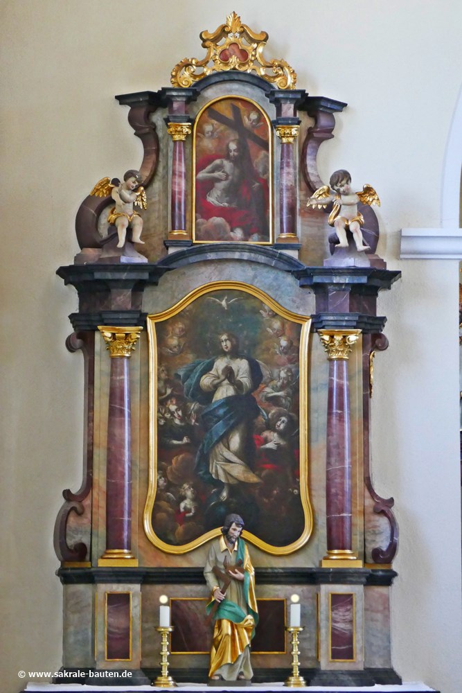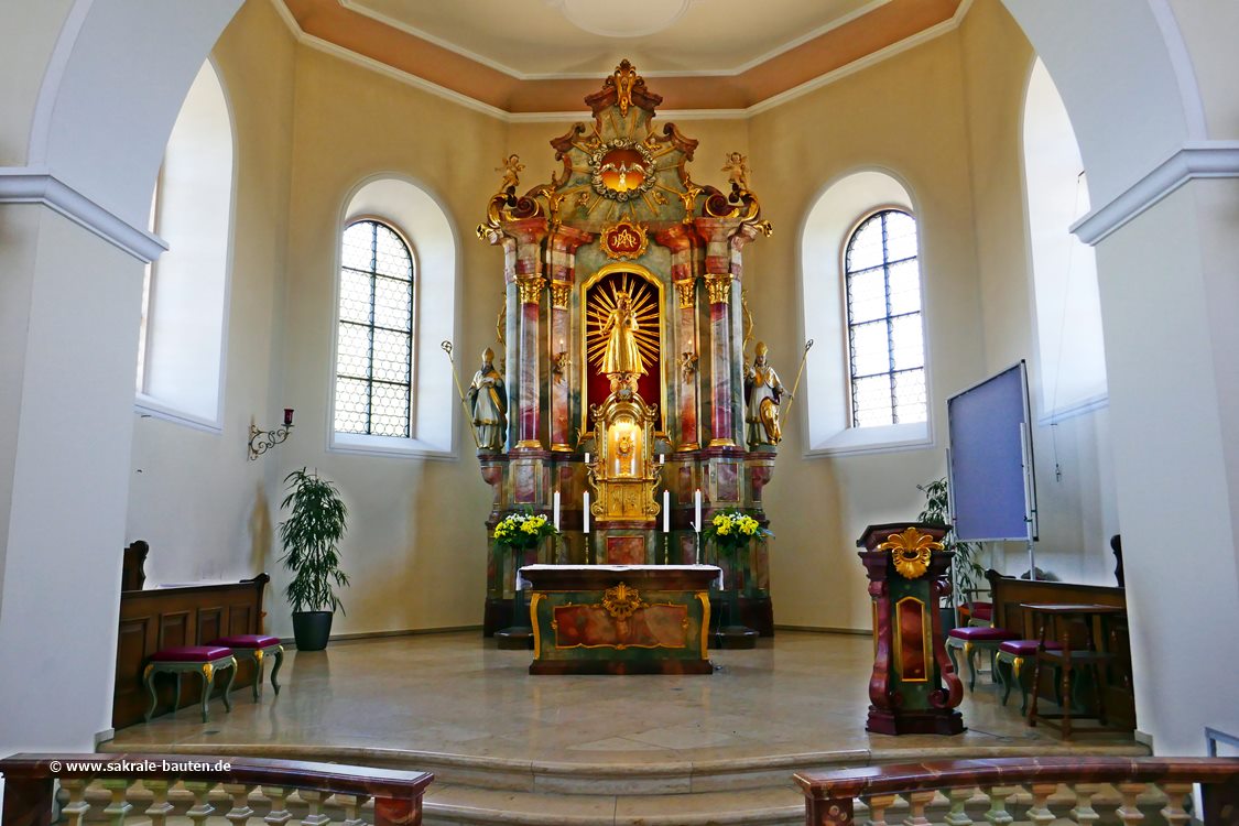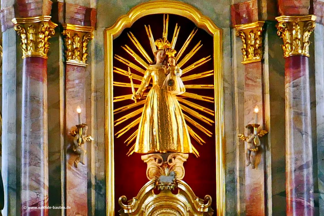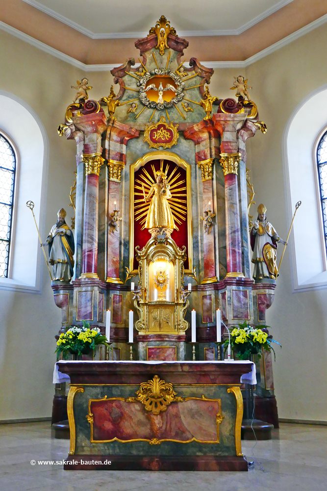 Der Hochaltar wurde um 1805 von Johann Michael Hartmann errichtet. Die zentrale Darstellung des gesamten Altars ist die „Strahlenmadonna“: