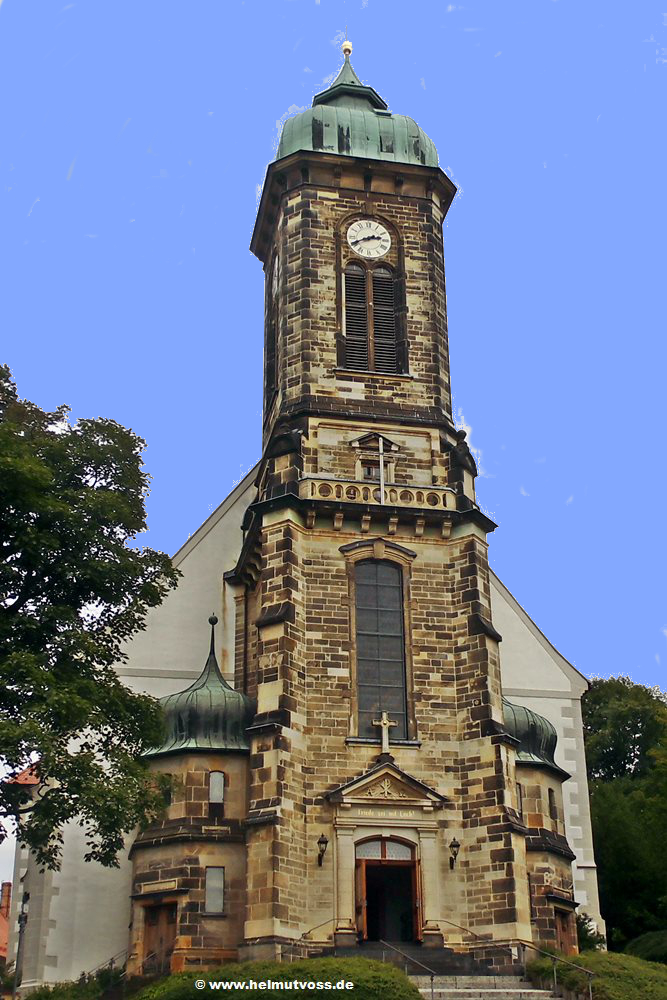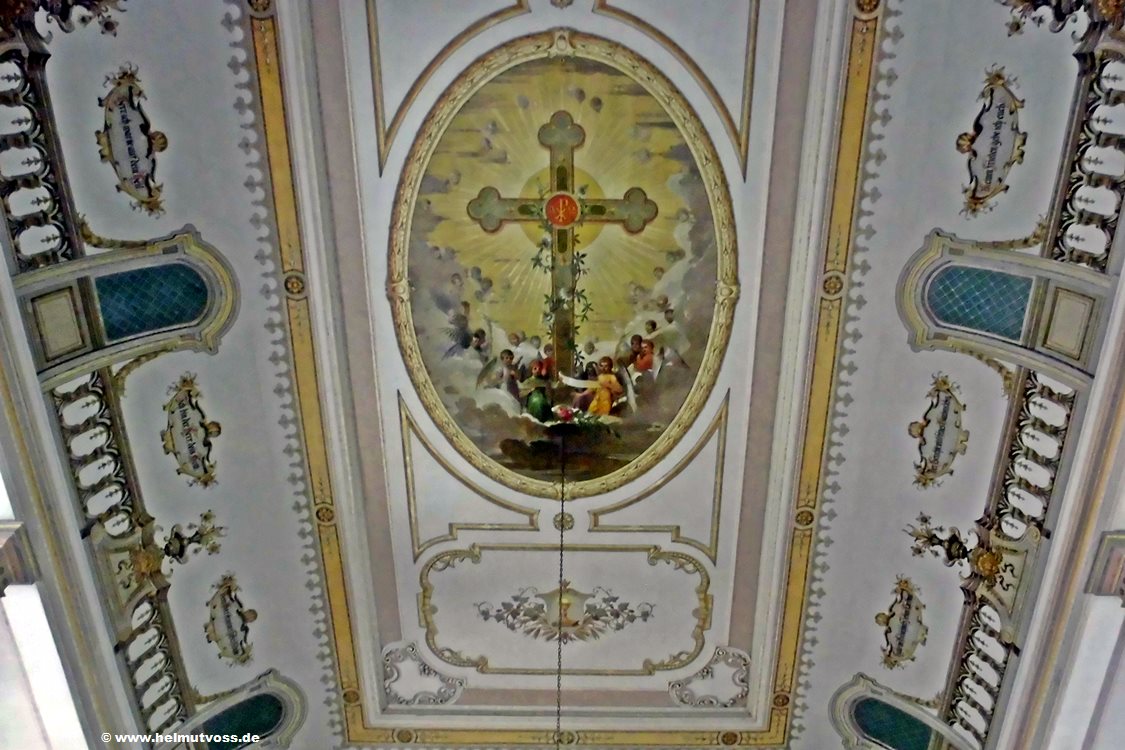 Das Deckengemälde von Reinboth. An der Decke des Kirchenschiffes der Stadtkirche befindet sich ein großes Gemälde mit Symbolen des christlichen Glaubens.