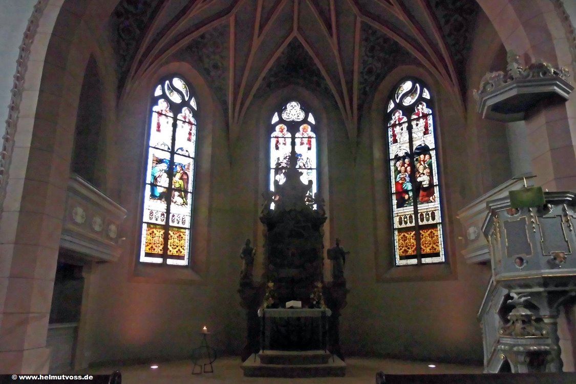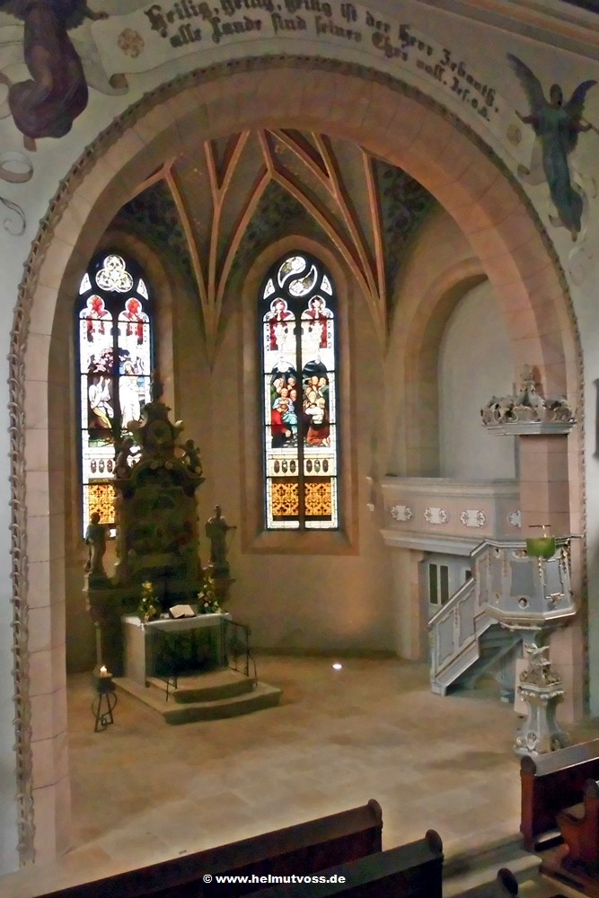 Die Wandmalerei über dem Chor aus dem Jahre 1898. Der barocke Altar aus Cottaer Sandstein aus dem Jahre 1770.