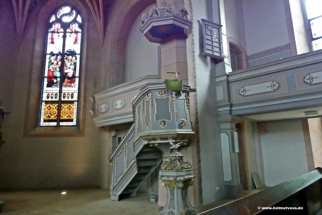 Die Barocke Holzkanzel, davor die Holztaufe aus denm Jahr 1727.