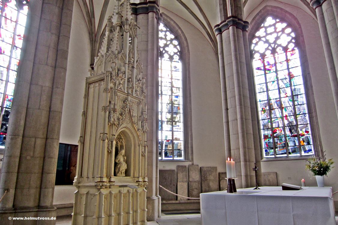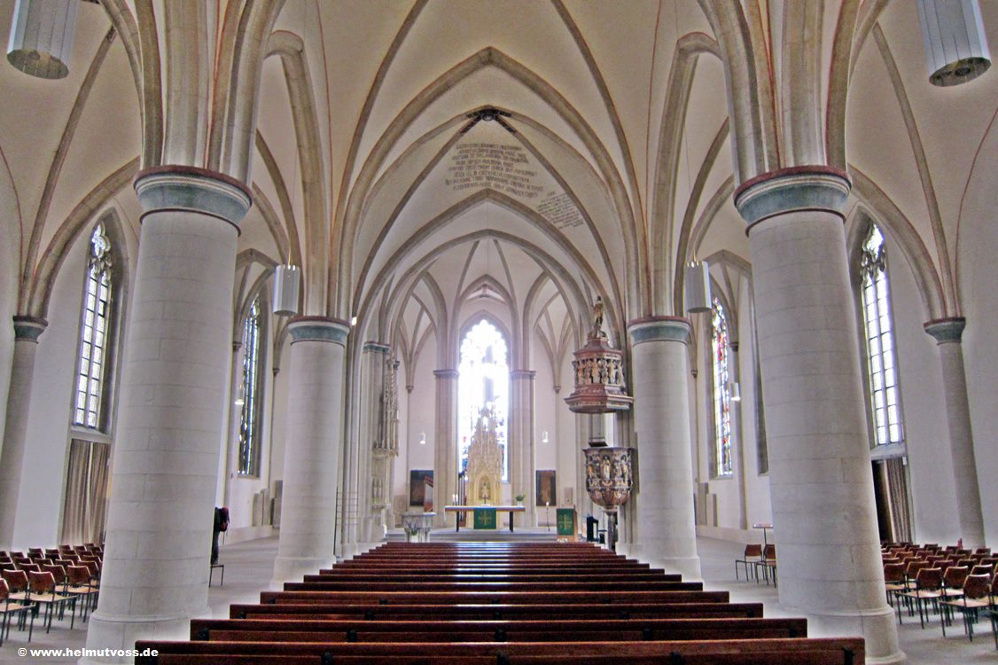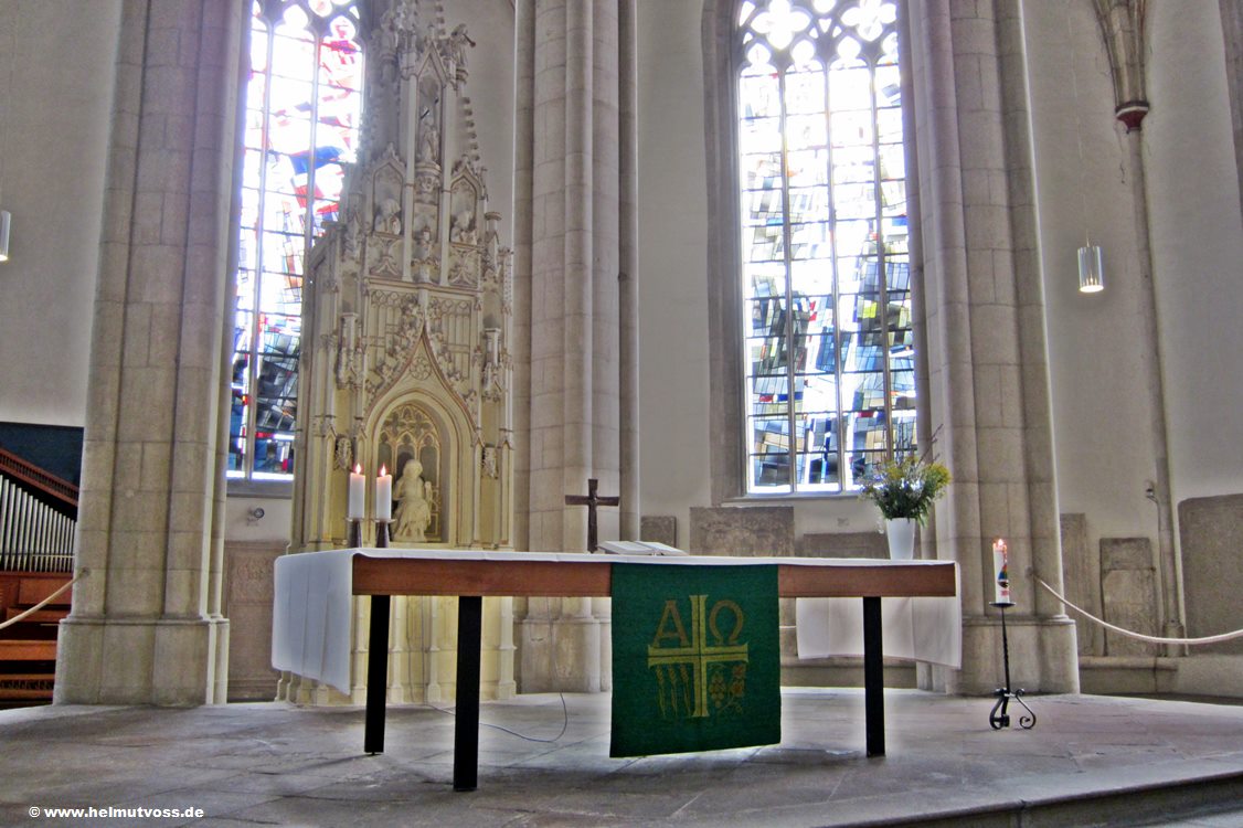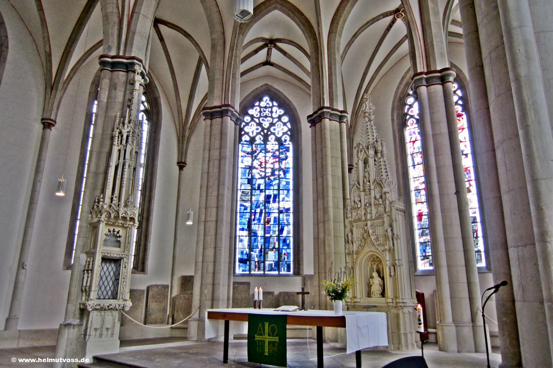 Hell und offen der gotische Chor. Die Seitenschiffe werden als Umgang um den Chor geführt. Altartisch und Lesepult von 1961.