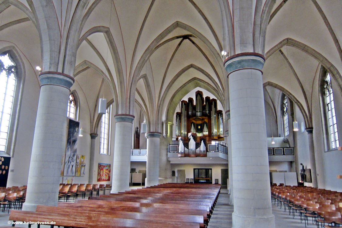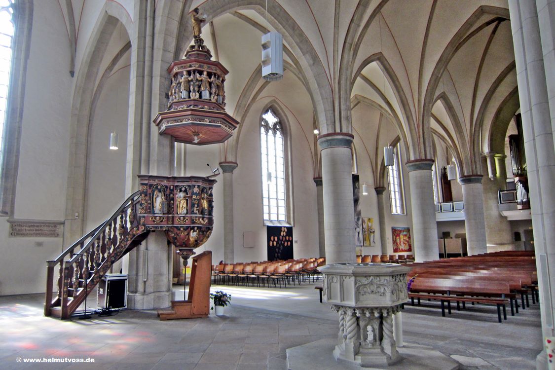 Vom offenen Altarbereich der Blick in die hohe Hallenkirche, Die barocke Kanzel und der Taufstein. Die Rensch-Orgel oberhalb der Empore.