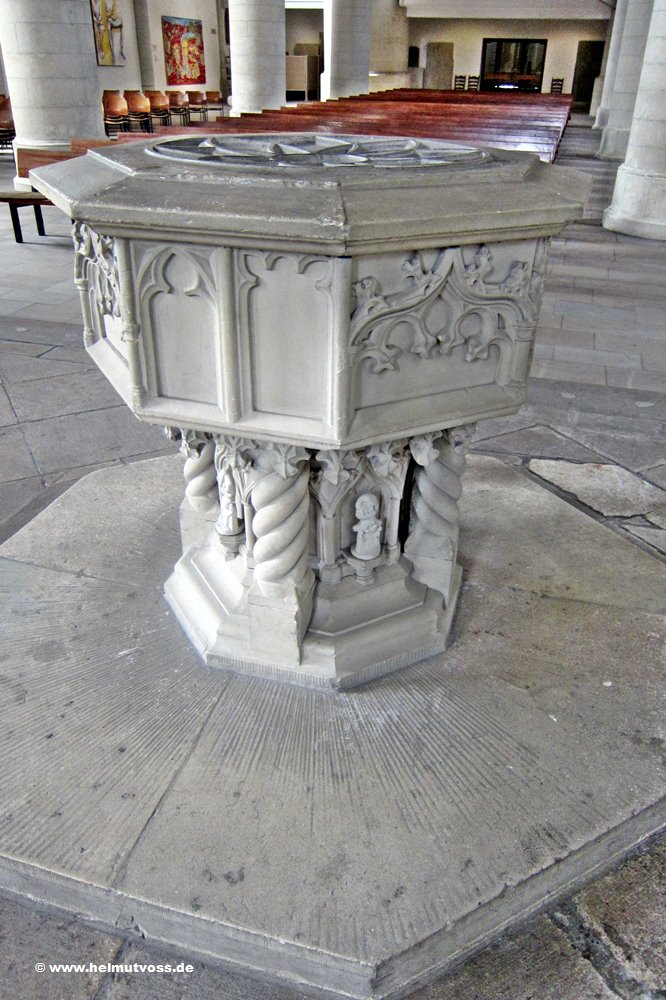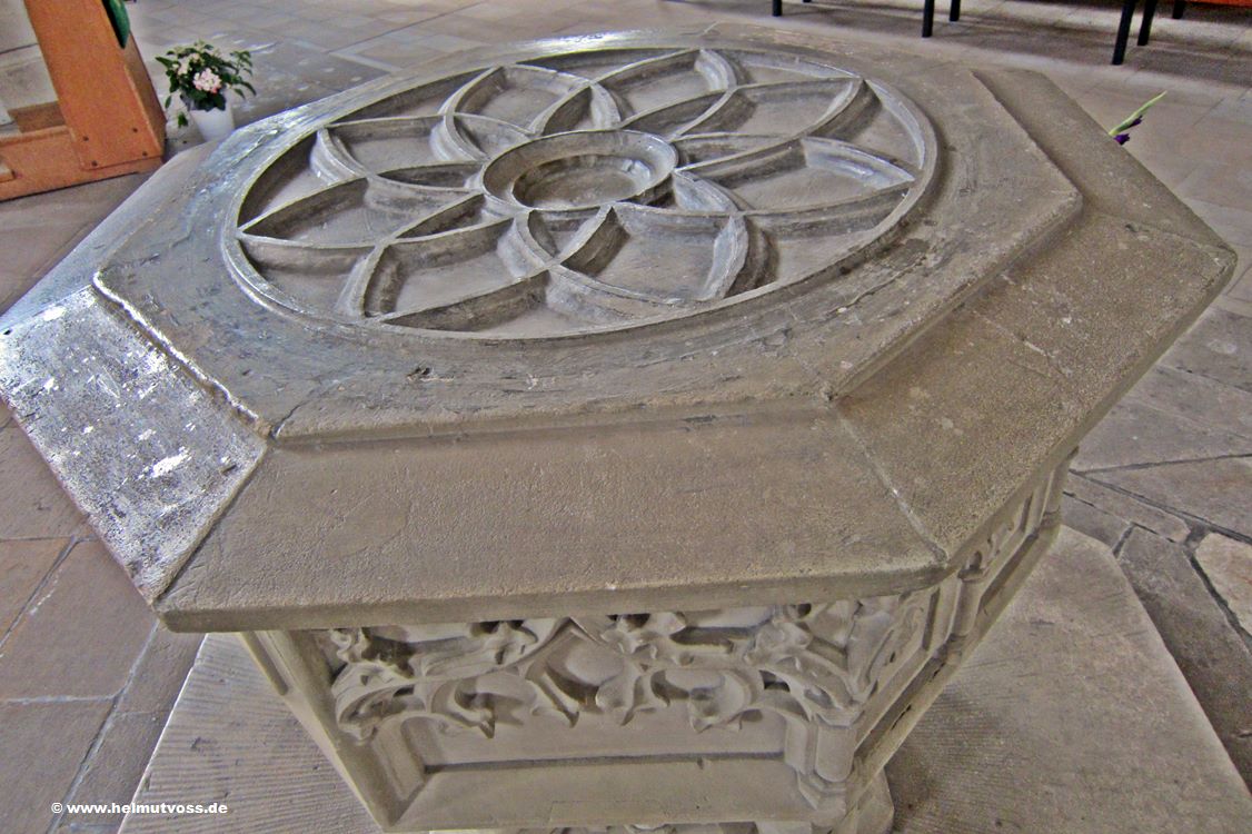 Der Taufstein aus der 2. Hälfte des 15. Jahrhunderts. 1875 renoviert. Die Säuleninschrift,