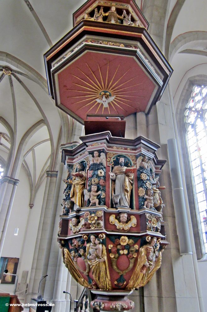 Barocke Kanzel aus dem Jahre 1667, von Meister Johann Sasse Attendorn. Kanzelkorb Mose und die vier Evangelisten.