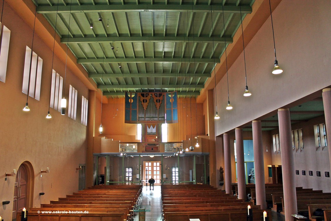 Das Kirchenschiff selbst ist innen klar und schlicht gehalten und wird vor allem von den kubischen Großformen aus hell gestrichenen Wandflächen,
