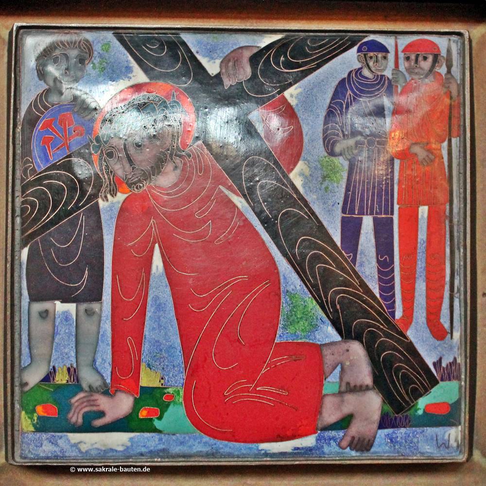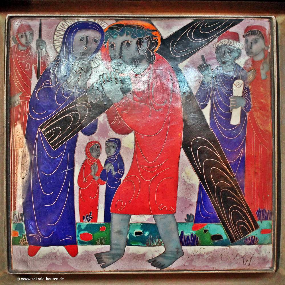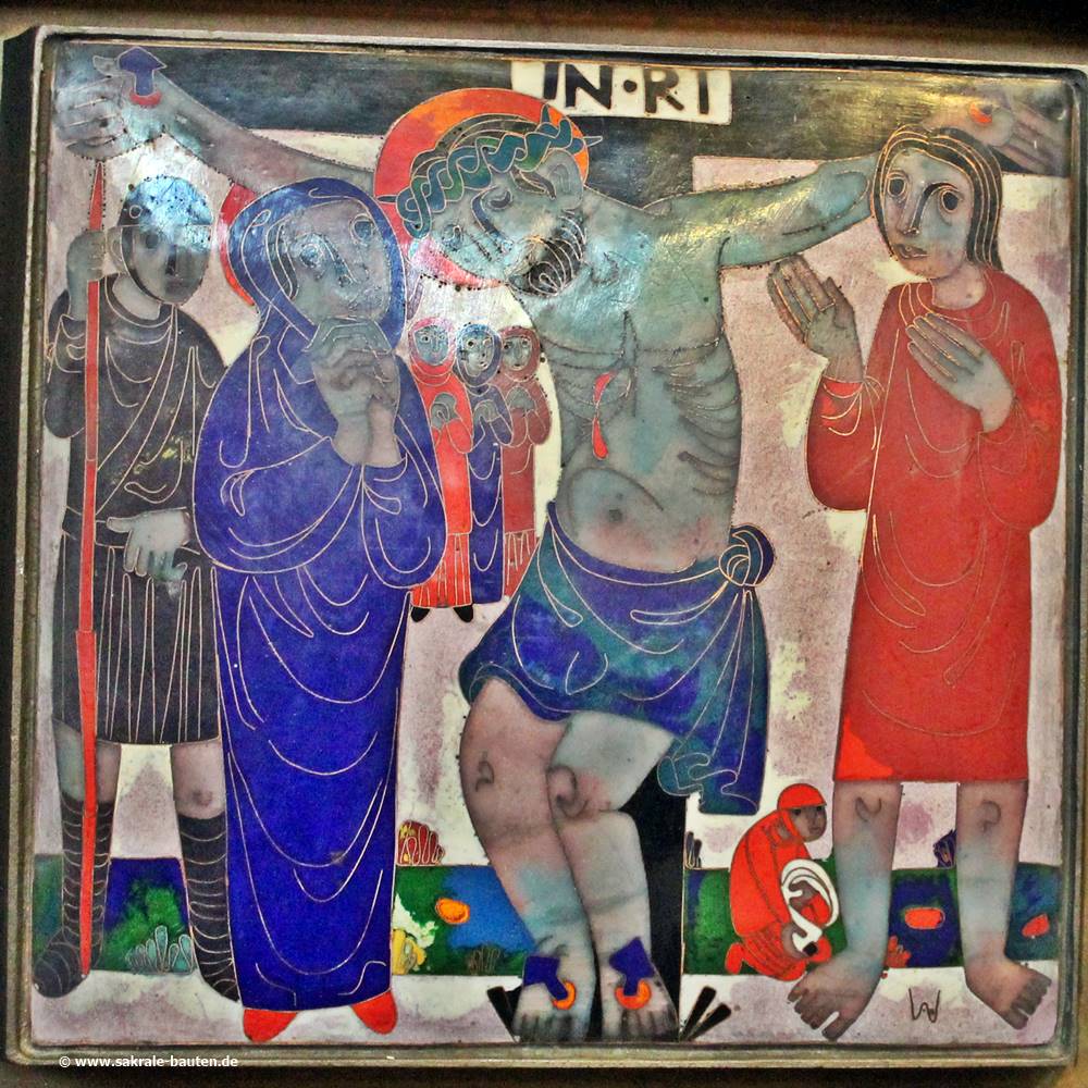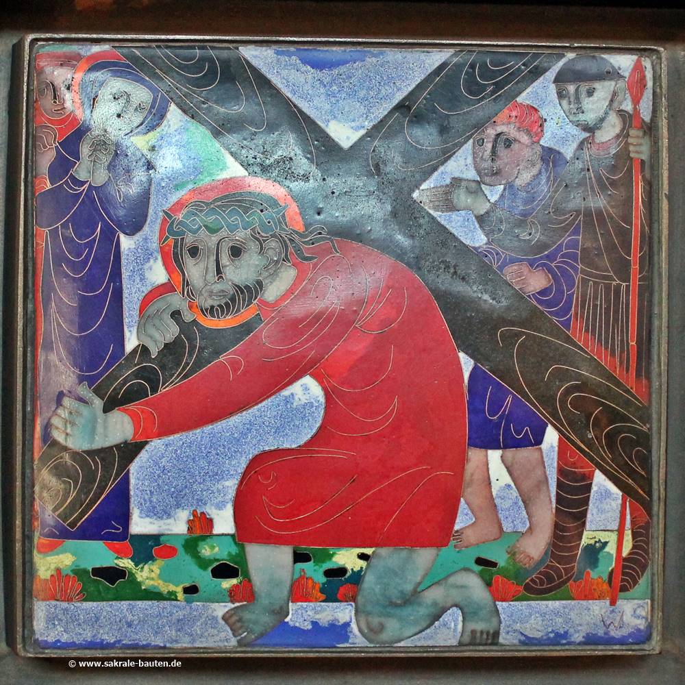 Im linken Seitenschiff, die 14 Kreuzwegstationen aus Emaille aus dem Jaht 1984 von Egino Weinert, Köln.