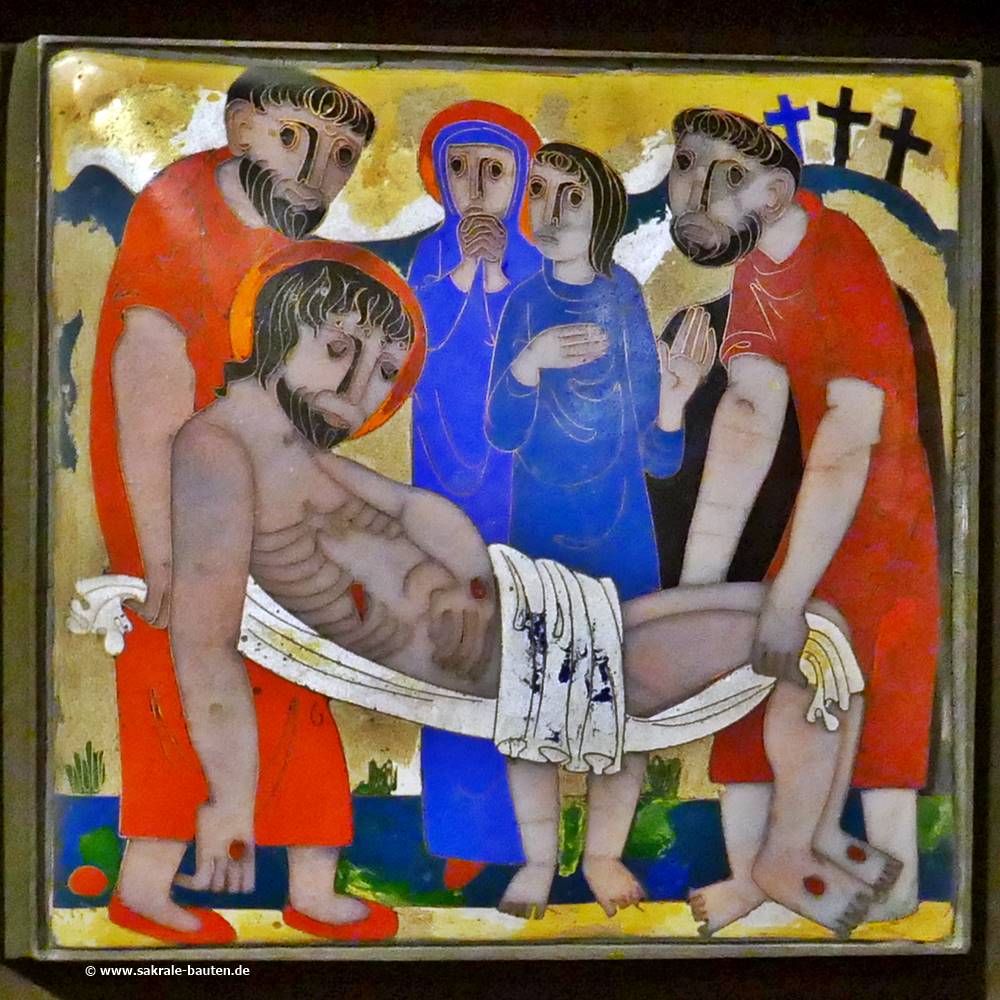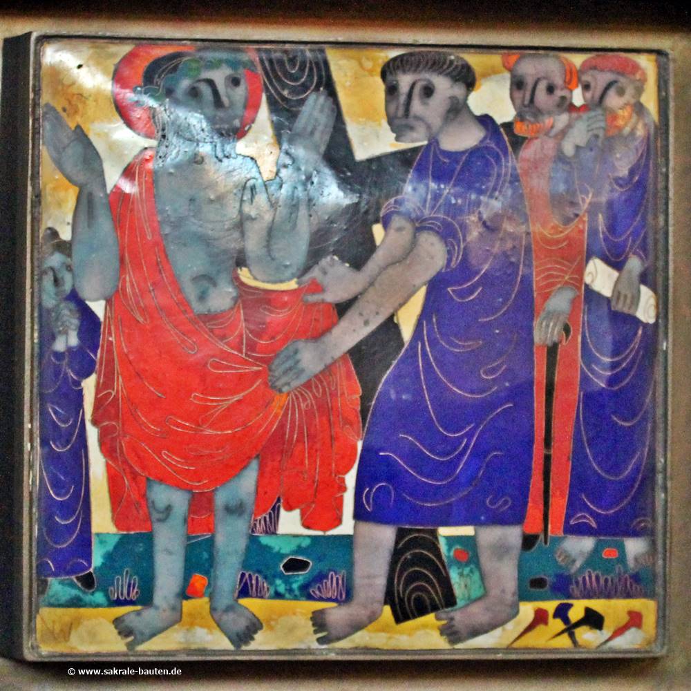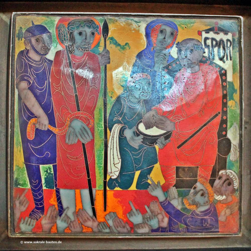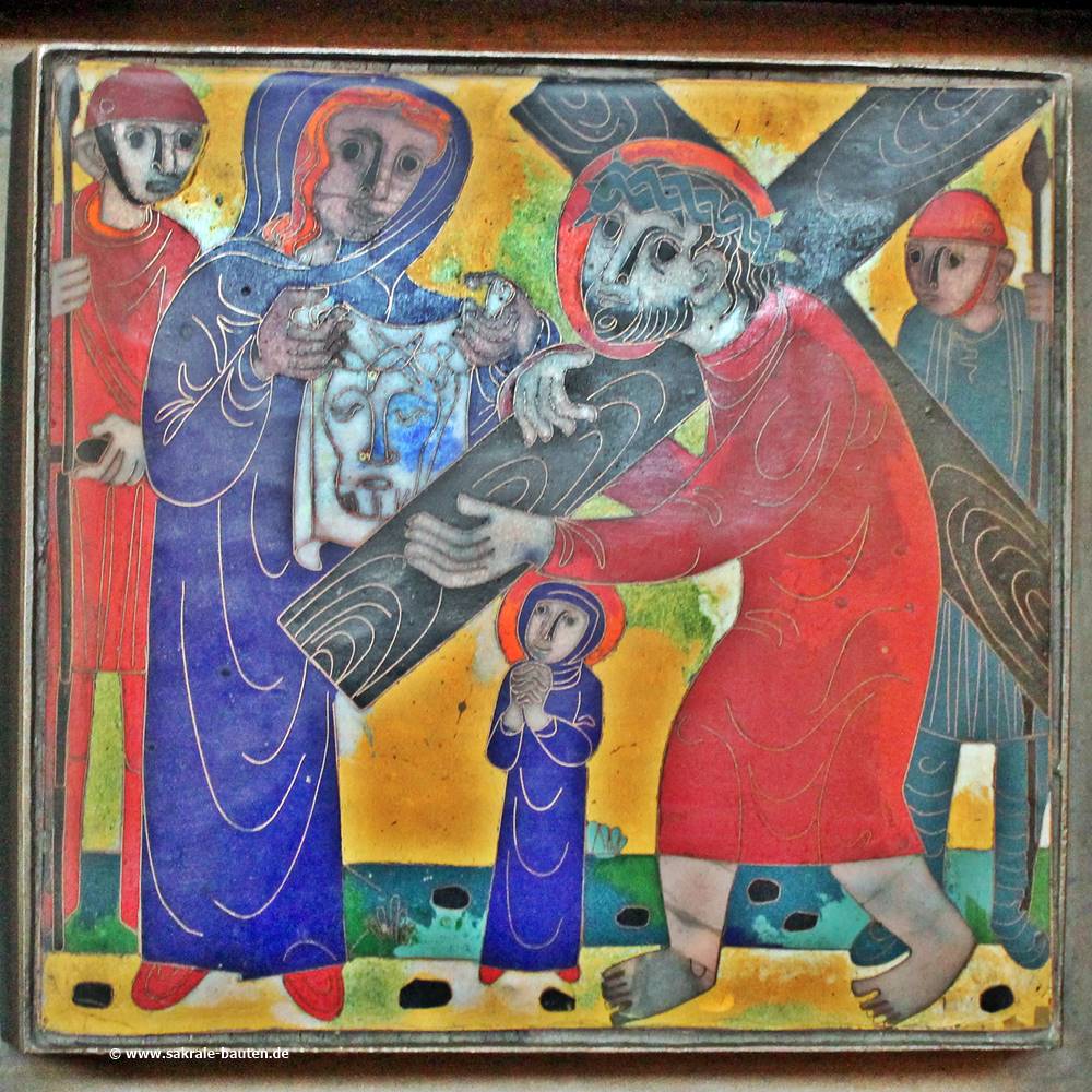 Im linken Seitenschiff, die 14 Kreuzwegstationen aus Emaille aus dem Jaht 1984 von Egino Weinert, Köln.